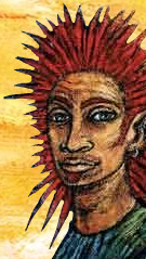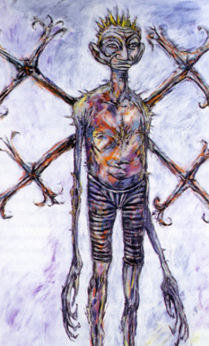 On his back there was a curious arrangement of cruciform rods that almost looked like four swords which had been fused to his bony body.