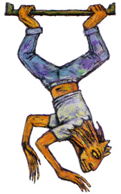 "I'm here," said a voice from above, and there (hanging down from a roof)